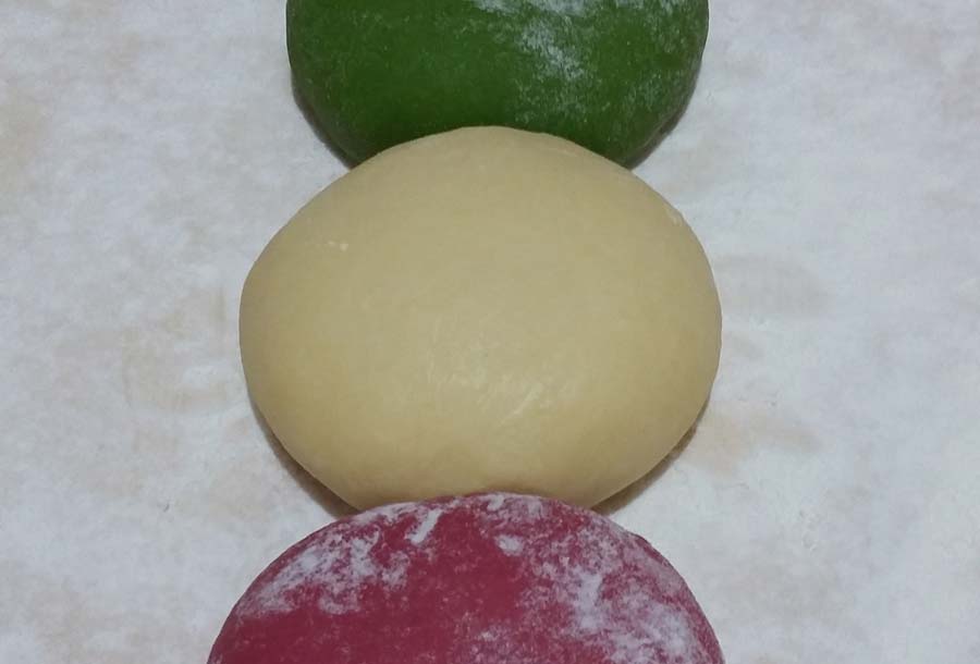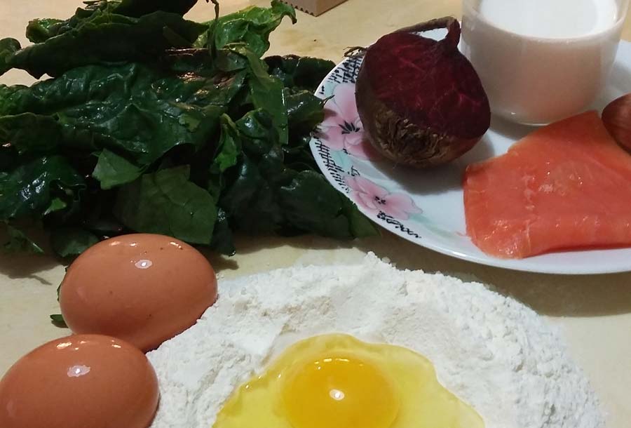 Prepara gli impasti per la sfoglia con: 1 etto di farina +1uovo — 1 etto di farina + 1 uovo e la rapa rossa lessata e tritata — 1 etto di farina + 1 uovo e gli spinaci lessati e tritati. Fai riposare i 3 impasti per mezz’ora. In una padella adeguata fai soffriggere, in poco olio, lo scalogno tritato, aggiungi il salmone tagliato a piccoli pezzi, la panna liquida e cuoci pochi minuti.