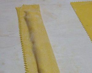 Con il mattarello tira la sfoglia molto sottile, taglia dei rettangoli di circa 25×10 cm. posiziona il ripieno, inumidisci i bordi, piega per il lungo poi arrotola per fare la rosa. Fai bollire una pentola di acqua salata, tuffa la pasta, cuoci 5 minuti, scola e metti tutto su di una placca imburrata, spennella le rose con il burro fuso poi in forno caldo 180 gr. per 10 minuti. Servi nei piatti con sopra il sugo di pesce preparato e porta in tavola.