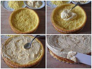 Ricoprire con il disco tagliato stendendo la crema restante e ricoprire l’esterno con il pan di spagna messo da parte per completare il dolce.
