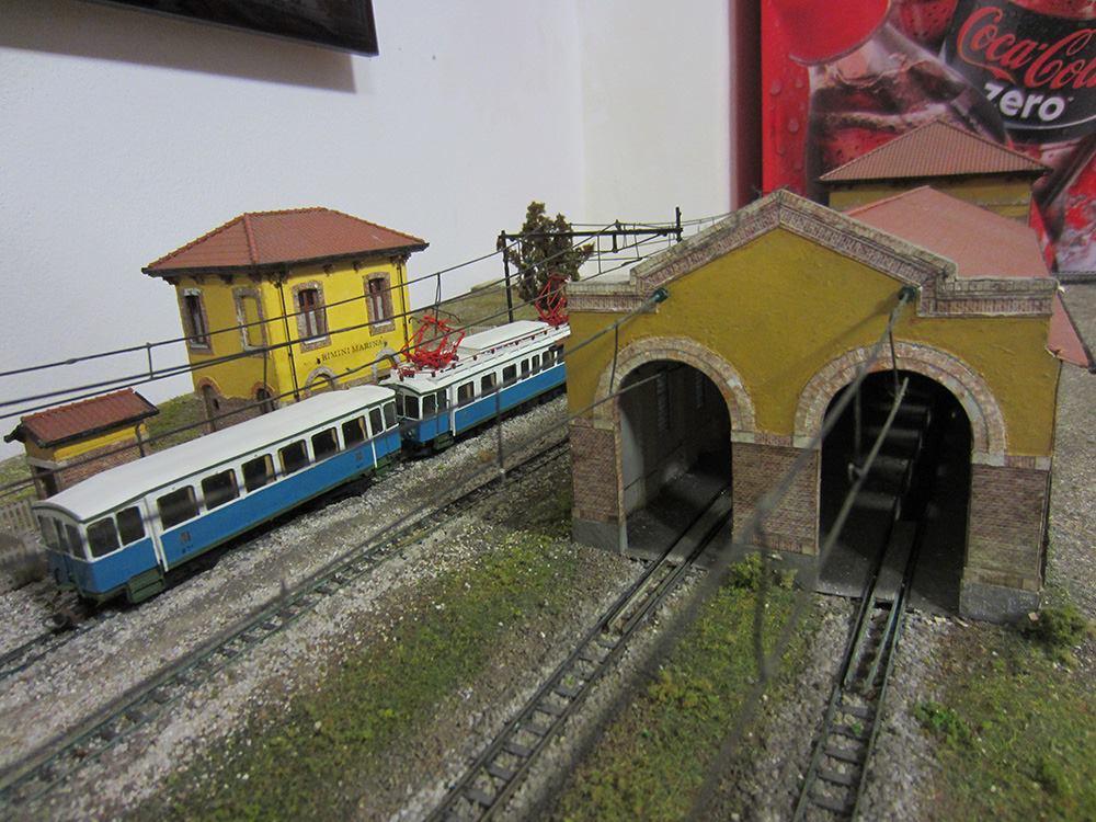 Riproduzione della Stazione di RIMINI FF.SS Centrale con annesso magazzino merci, da cui partiva la linea ferroviaria RIMINI – SAN MARINO. (oggi, sono i due binari tronchi, lato EST della stazione di RIMINI, da cui partono i treni regionali diretti ad ANCONA).