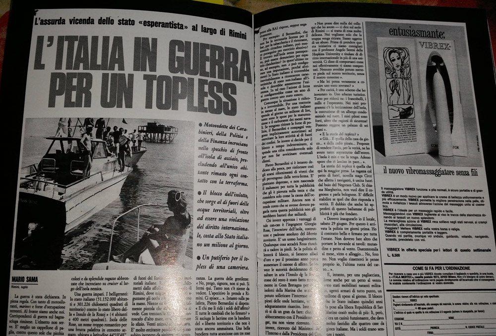 La Repubblica Italiana accusò l’ingegnere Giorgio Rosa di avere costruito un paradiso fiscale in cui non venivano pagate le tasse. Altre voci ufficiose dicevano che l’isolotto era stato sedimentato in un punto che avrebbe potuto interessare all’Eni per le escavazioni.